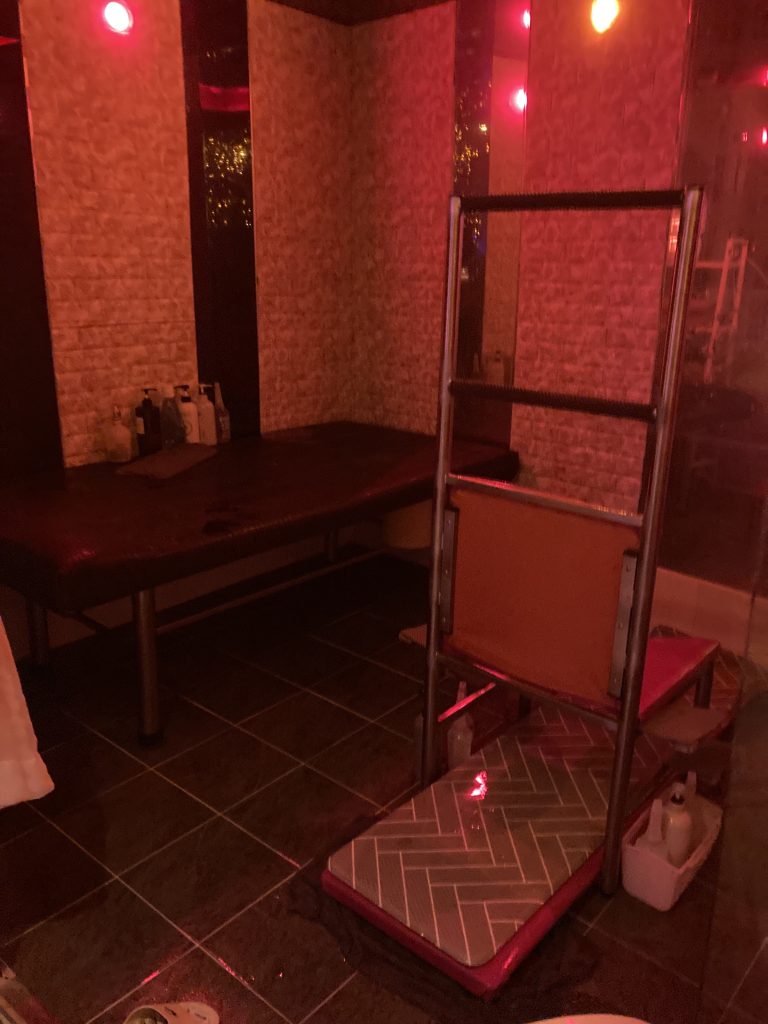 と思っていたら、マッサージは終わり、奥のシャワーと謎のイスのあるマットエリアに招かれる。