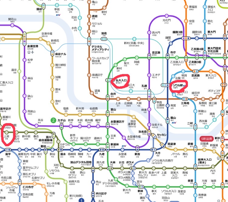 路線図これぐらい小さくしないとダメなぐらい、観光客にも馴染み深いソウル駅や弘大駅からはかなり西端にある。