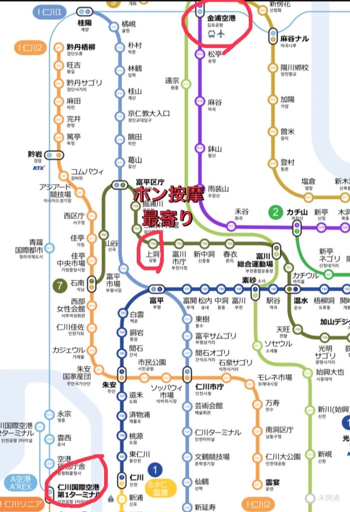 ホン按摩は上述通り仁川空港からも金浦空港からも近い。地下鉄7号線のサンドン駅(상동)が最寄り。