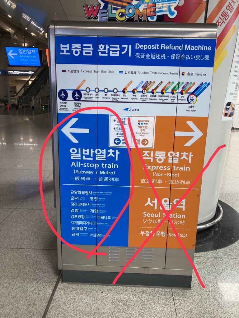 空港からは鉄道の案内がデカデカと出ているので迷うことはないと思うが、一つ注意しないといけないのが特急(ソウル直行)に乗らないこと!