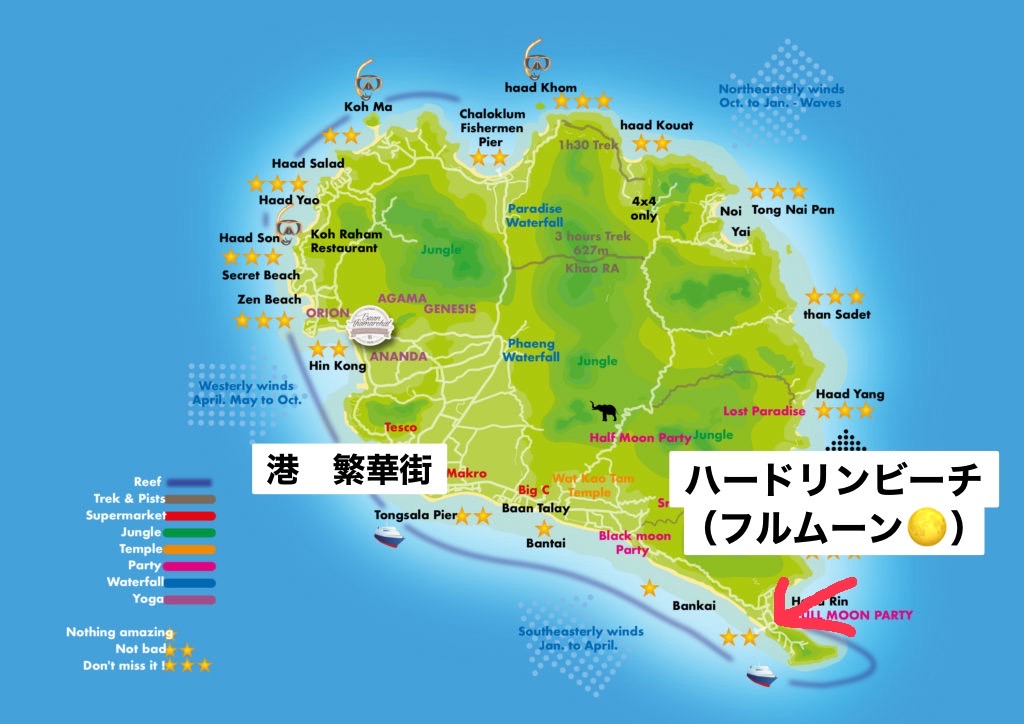 一方、フルムーンパーティが行われるのはハードリンビーチ(MAPの右下)。