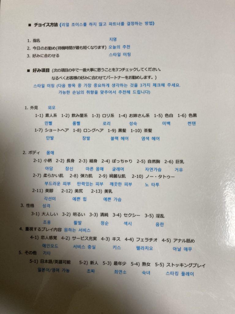 そして、気になったのは入店後に好みの女の子を伝える「スタイルミーティング」があるのだが、これの項目がかなり細かいw