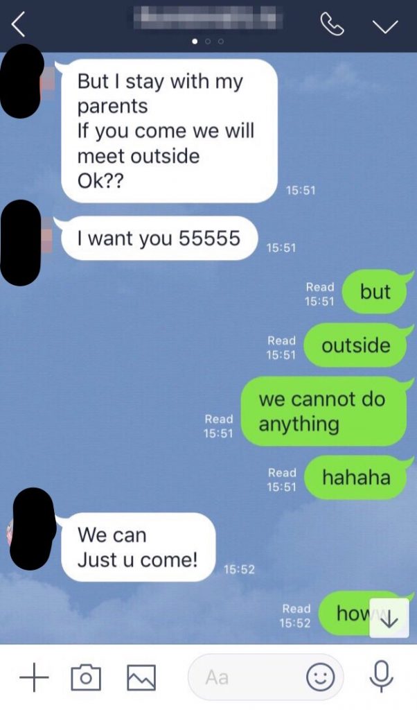 特徴としては、日本のように業者がサクラアカウントで釣り、別のサイトへ誘導するタイプは少なく、個人が売春を持ちかけてくるのが1番多いパターン。